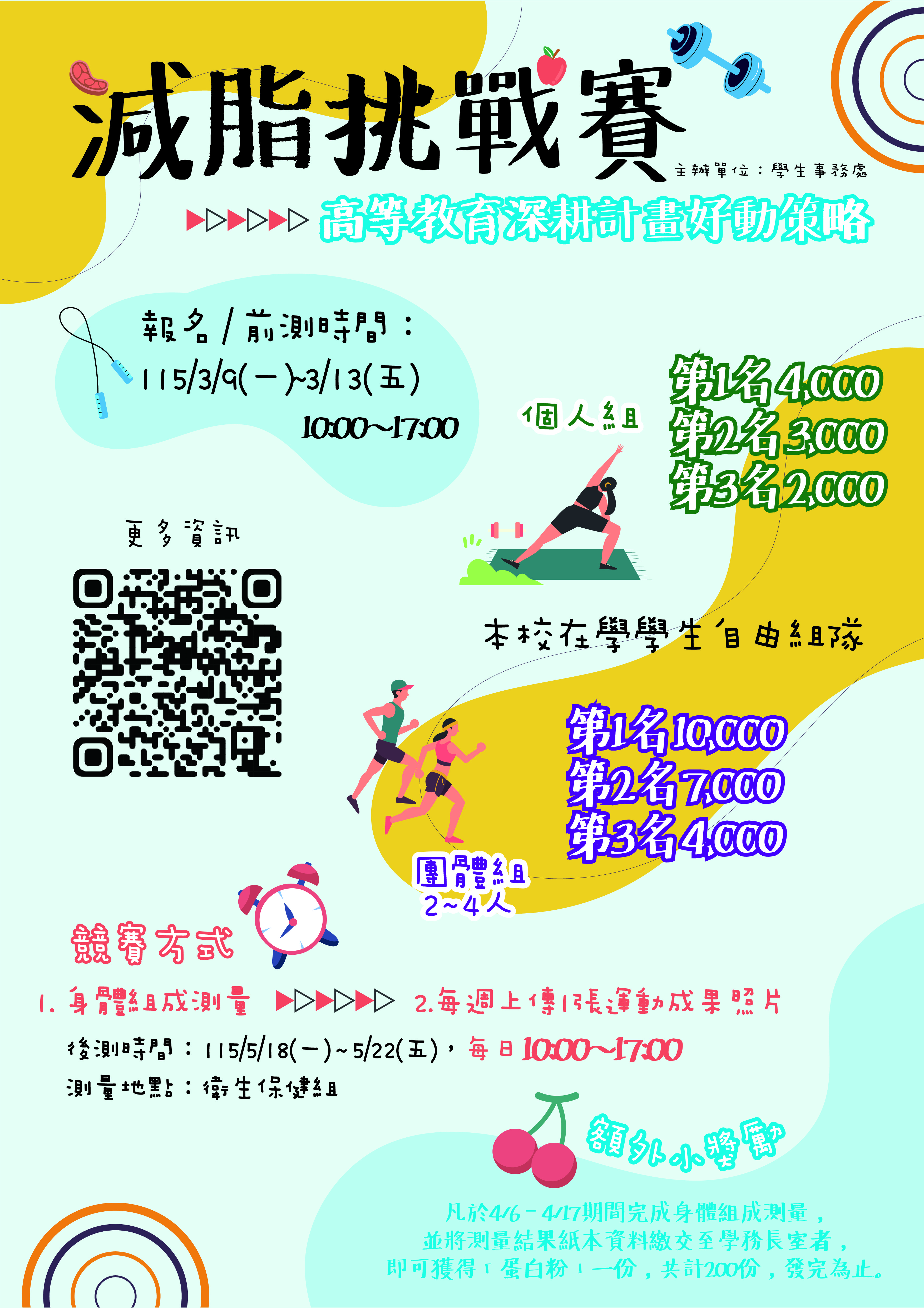 轉知學務處高等教育深耕計畫六好策略-好動:為提升學生自我健康管理,辦理全體學生「第二屆減脂挑戰賽」活動,印製宣傳海報及活動計畫乙份