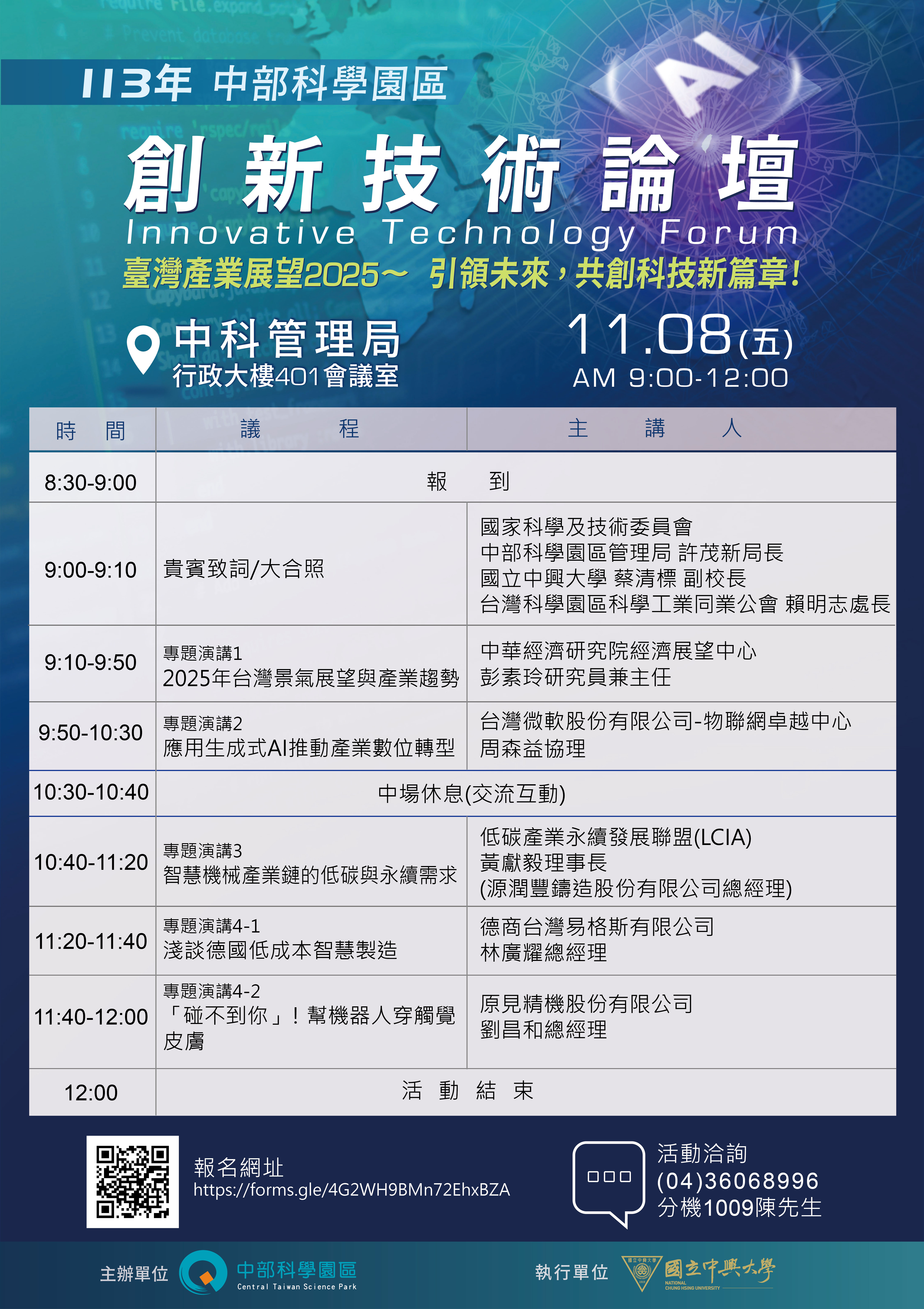 一、本論壇以「台灣產業展望2025,引領未來,共創科技新篇章」為主題,聚焦2025年產業趨勢、生成式AI、低碳永續、智慧製造及機器人等領域,邀請研究機構及廠商進行景氣展望、創新技術發展趨勢與應用案例分享。