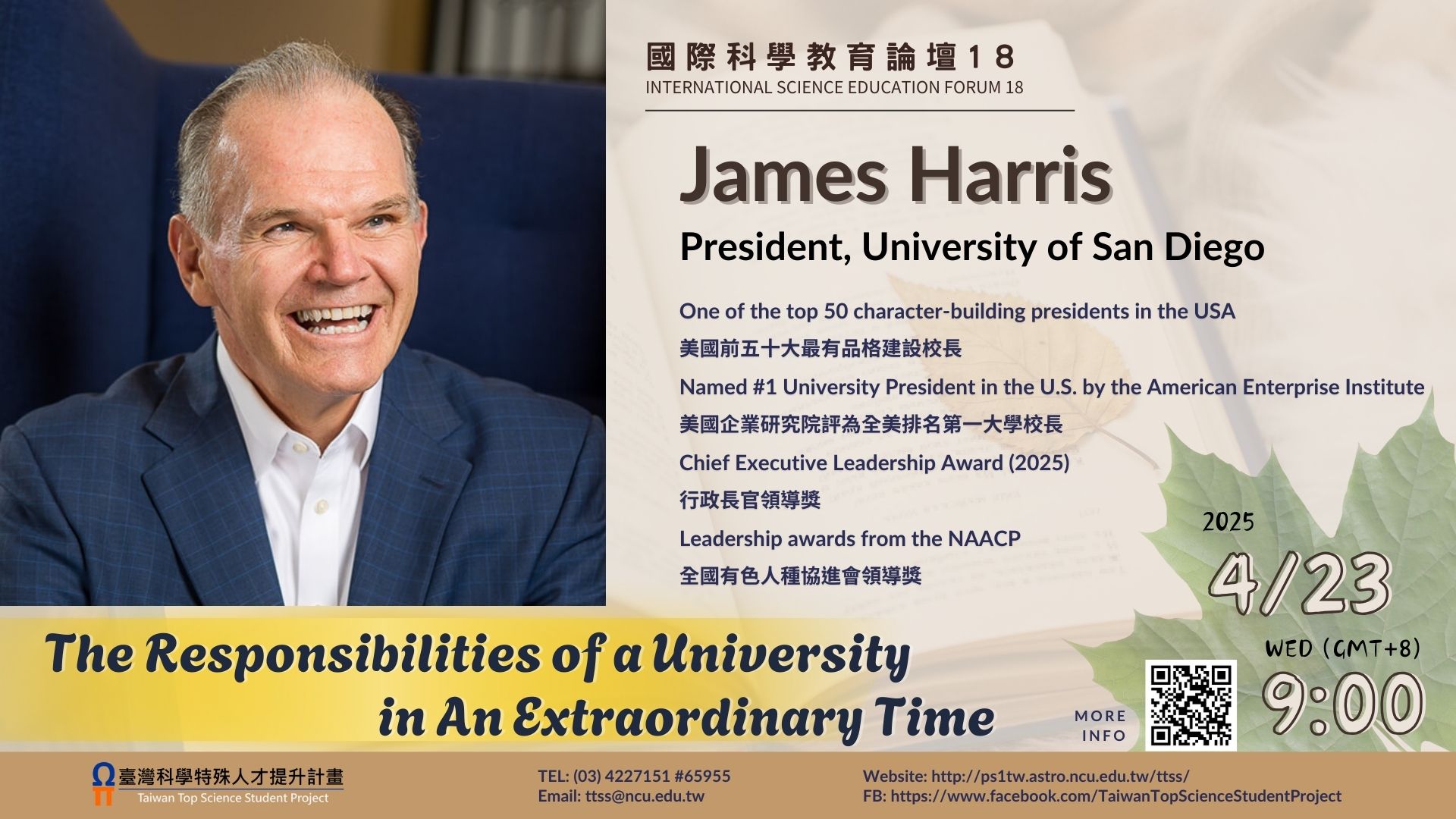 一、本次講座由聖地牙哥大學校長Dr. James Harris主講。研究教育學的他,在擔任校長期間,除了因營運管理及生活環境使聖地牙哥大學被評為全美最佳大學之一,也使其大學在可持續性、多樣性與包容性方面贏得了廣泛的讚譽。Dr. Harris也在2024年被美國企業研究院評為全美排名第一大學校長。此次演講將與我們探討在特殊時期的大學責任。