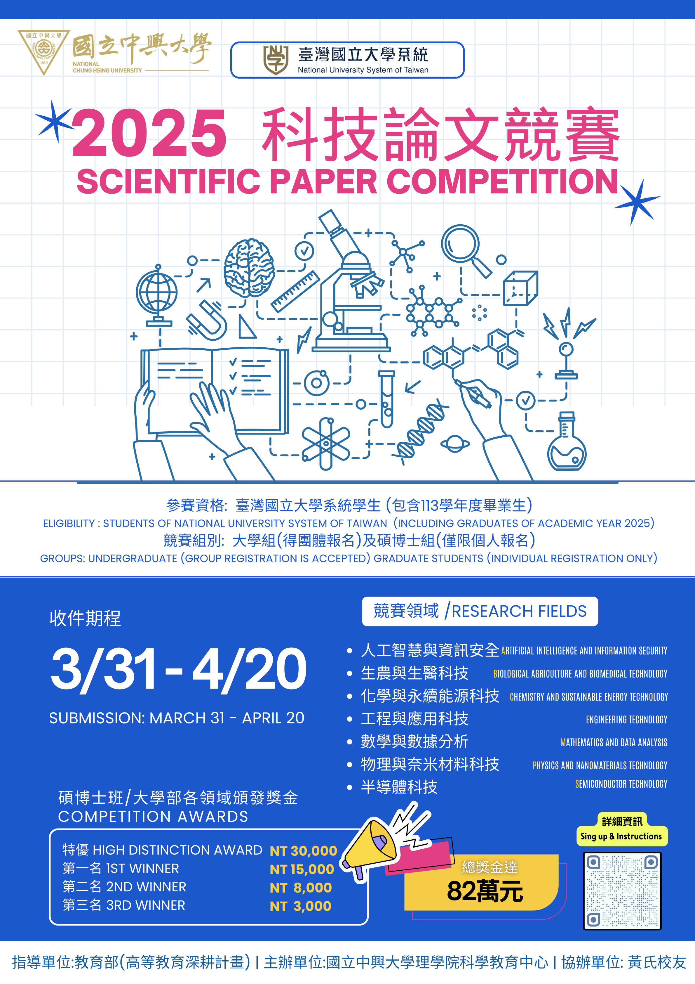 二、敬邀本校師生踴躍參與科技論文競賽,獎金高達82萬元。